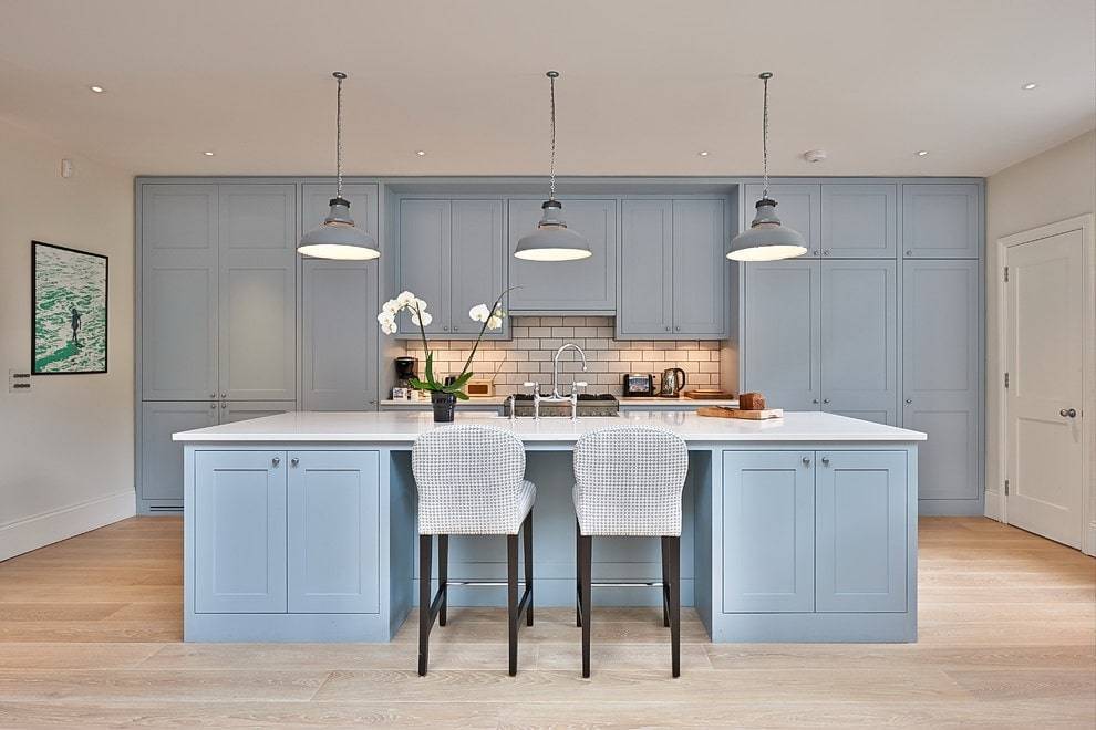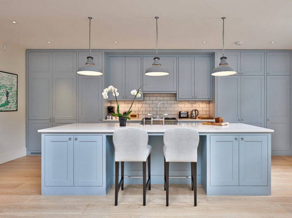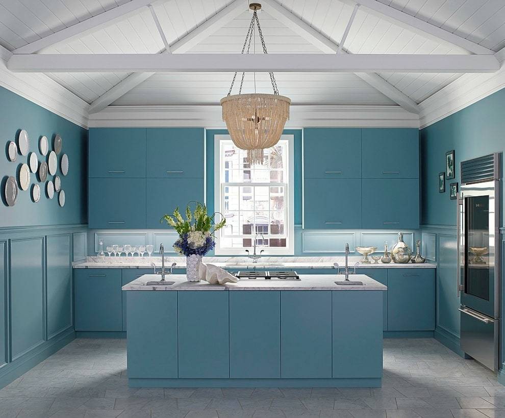 Голубая кухня с массивной люстрой станет главной «фишкой» дома