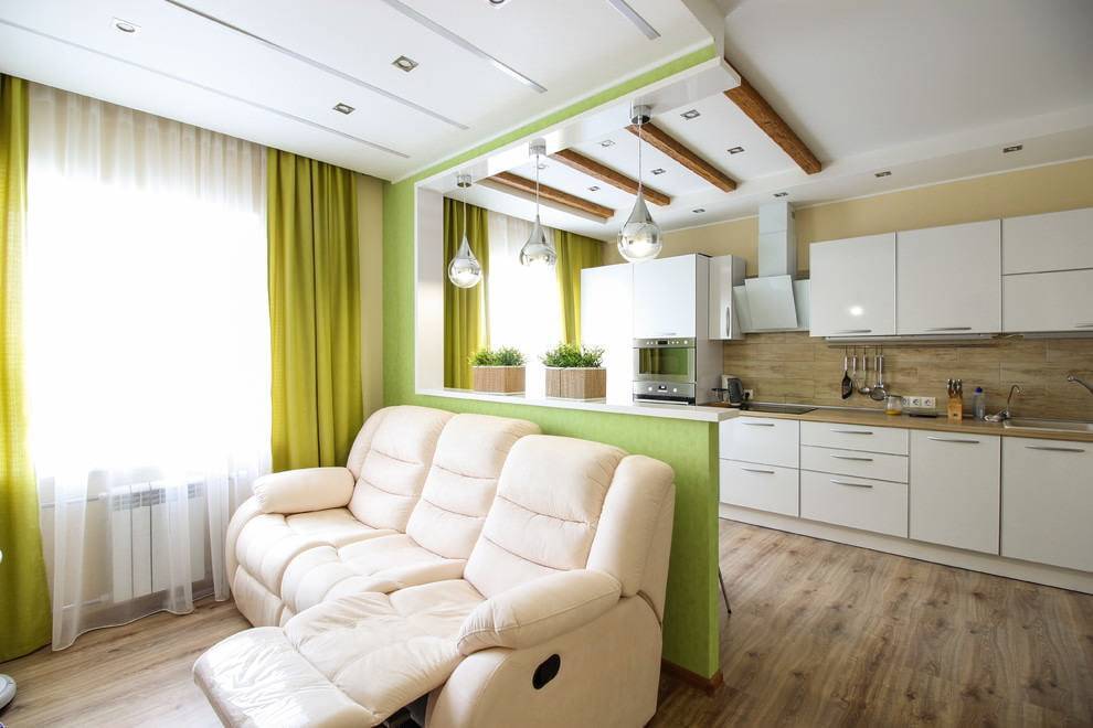 На фото: сочетание салатового и бежевых оттенков в интерьере кухни-гостиной.