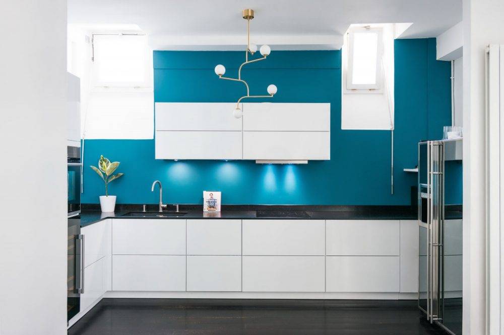 Можно выкрасить в голубой цвет только одну акцентную стену, как в этой кухне скандинавского стиля