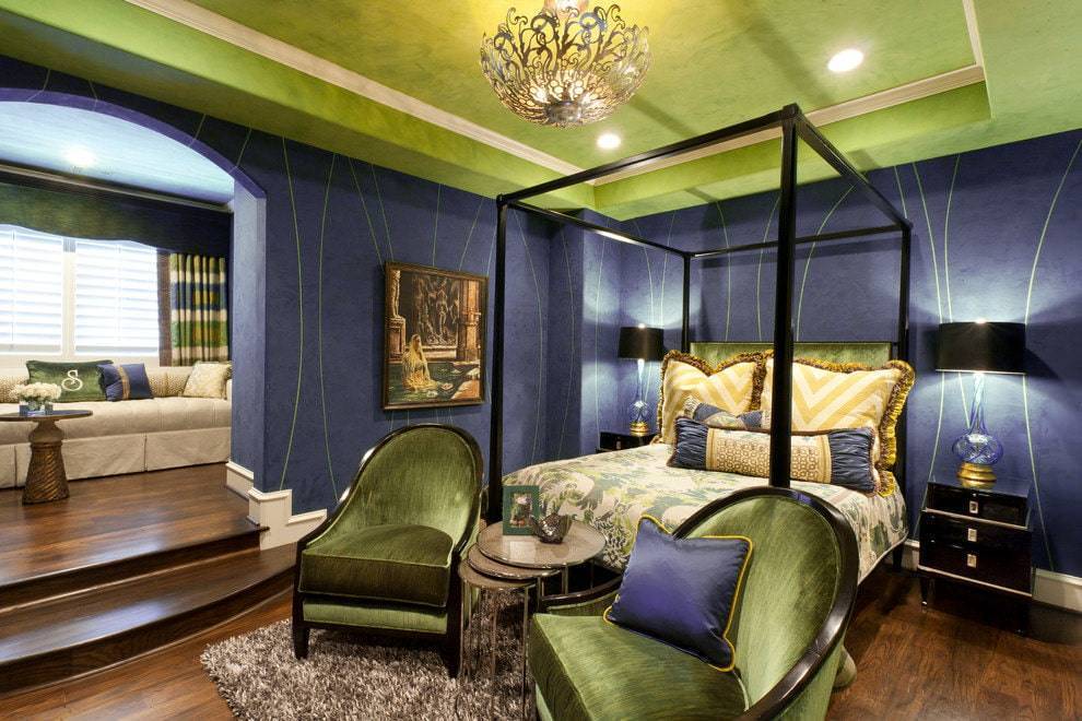 лазурный и чёрный является стильной и яркой комбинацией. Не следует использовать в интерьере много чёрных деталей, ведь это сделает обстановку мрачной. Достаточно только бытовой техники или напольного покрытия тёмного цвета;