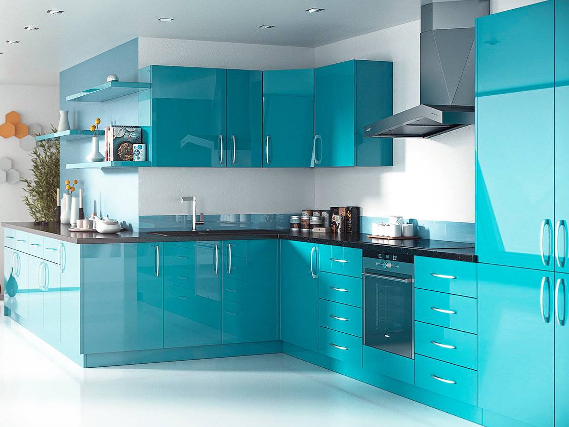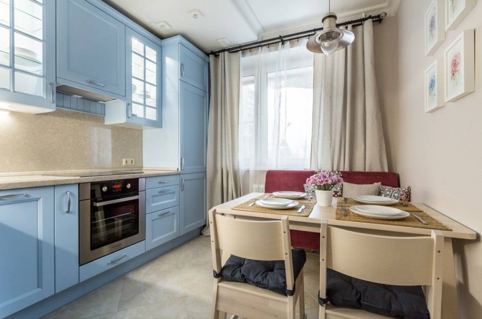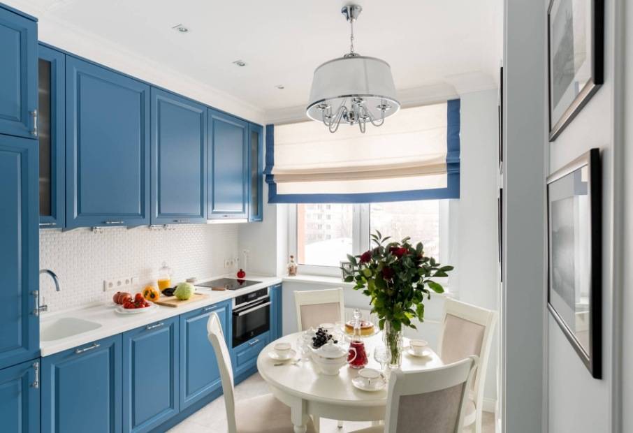 - С пространством цветовая палитра сочетается довольно удачно. Например, голубой не «съедает» свободное место, подходит для узких кухонь и комнат.