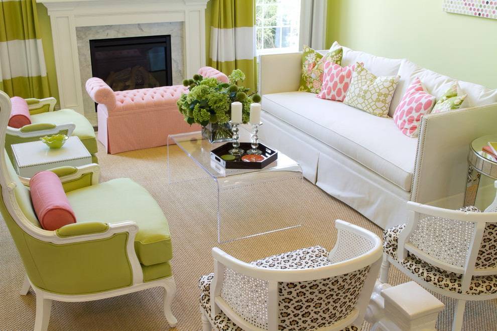 В декоре салатовый цвет довольно выразителен, он прекрасно сочетается со спокойными оттенками.