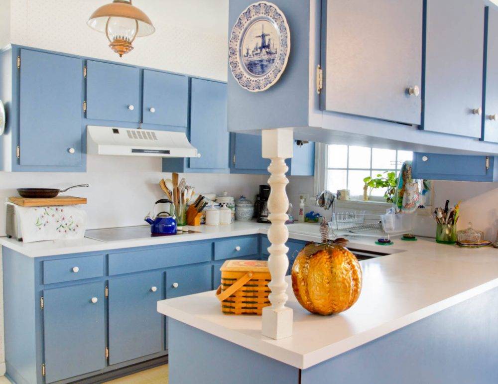 голубой и белый — классическая и красивая комбинация. В этих тонах можно оформить всю кухню или только стены, пол или потолок. Двухцветный гарнитур в бело-голубой гамме также выглядит оригинально;
