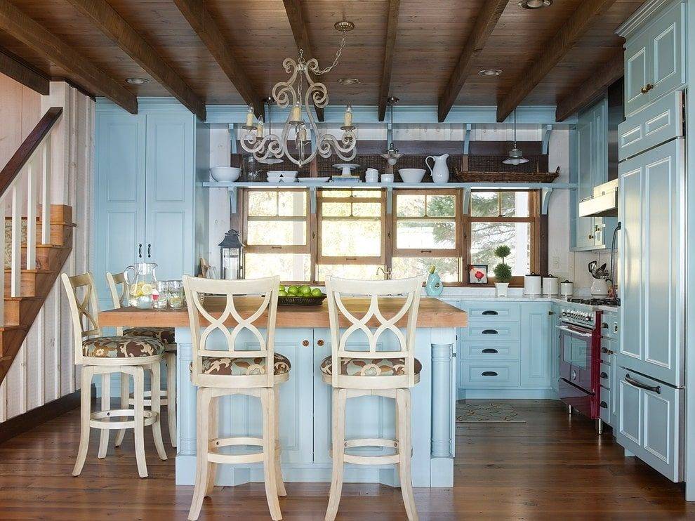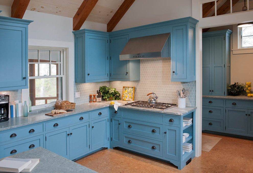 Атмосфера в такой кухне дышит уютом и теплом домашнего очага. Синяя мебель хорошо сочетается с натуральным деревом. Дополняющими элементами могут служить тканые коврики, вышитые вручную скатерти, расписная керамика.