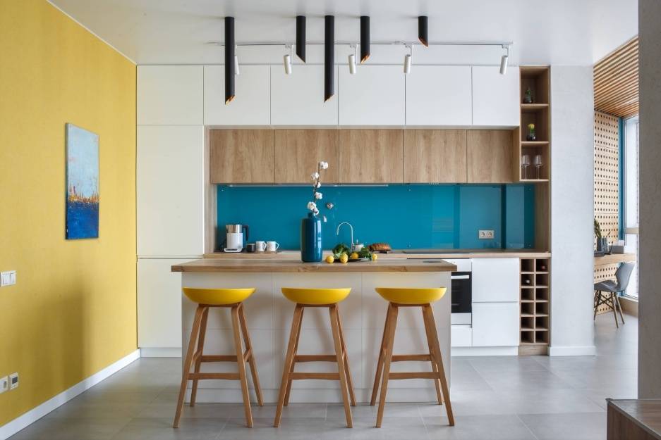 дополнение голубого цвета жёлтым делает интерьер жизнерадостным и нарядным. Оттенки могут быть бледными или насыщенными. Эффектным является жёлто-голубой гарнитур. Не менее стильно выглядит и фартук, но можно разнообразить интерьер разноцветной посудой;