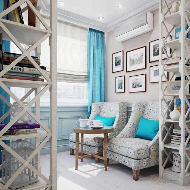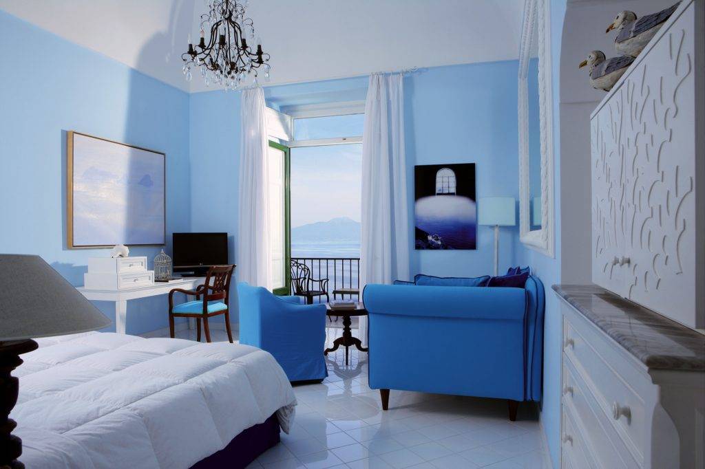 Голубой цвет добавляет света и подходит для комнат с большими окнами.
