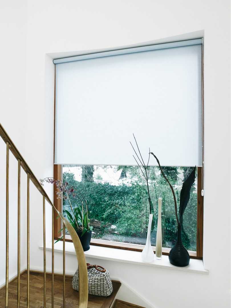 - Спальню в стиле минимализм или морском стиле, украшают рулонными занавесками.