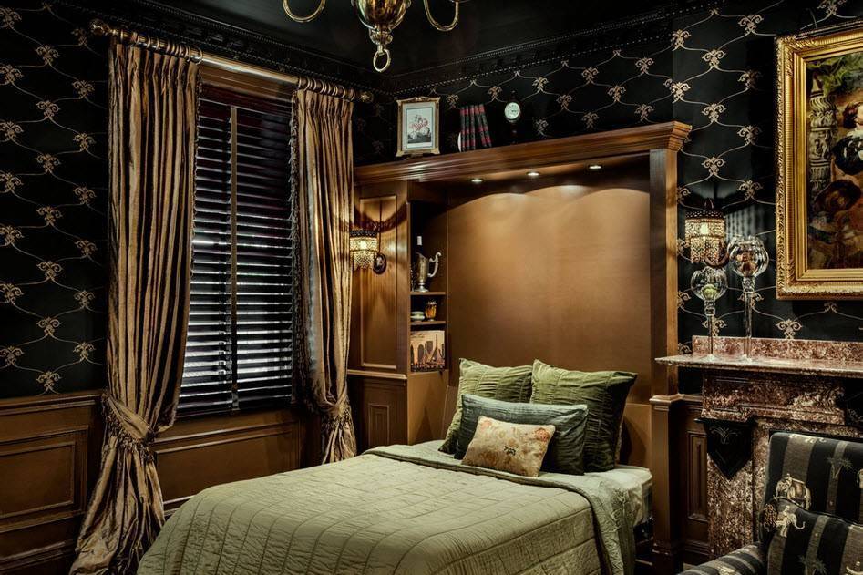 Для отделки используются натуральные материалы и, конечно, дерево. Кровать стоит у стены, она выполнена в классическом стиле, обязательно присутствуют прикроватные тумбочки и комод. Если комната достаточно просторная, можно устанавливать и платяной шкаф.