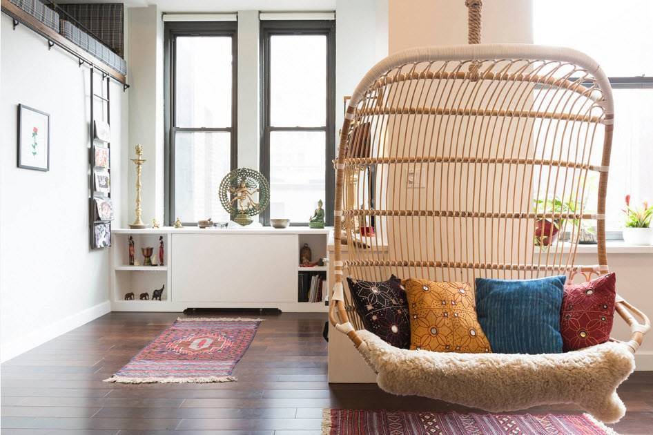 Из мебели главной является кровать или диван с добротной обивкой и большим количеством подушек и пледов. Журнальный столик на колесиках и большое количество кресел, пуфов, вот и вся мебель. Большой телевизор в интерьере украшает кирпичную стену, а для досуга можно повесить гамак или корзину для мяча.