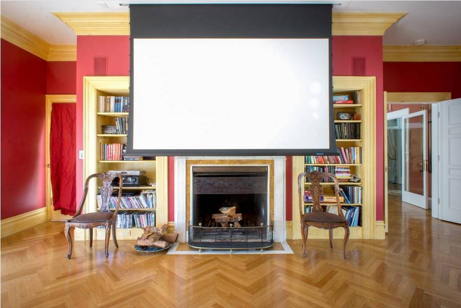 Оригинальная альтернатива телевизору – проектор. В этом американском интерьере вместо ТВ над камином повесили мобильный проектор. Декораторский тонкий юмор витает в пространстве и поднимает настроение окружающим.