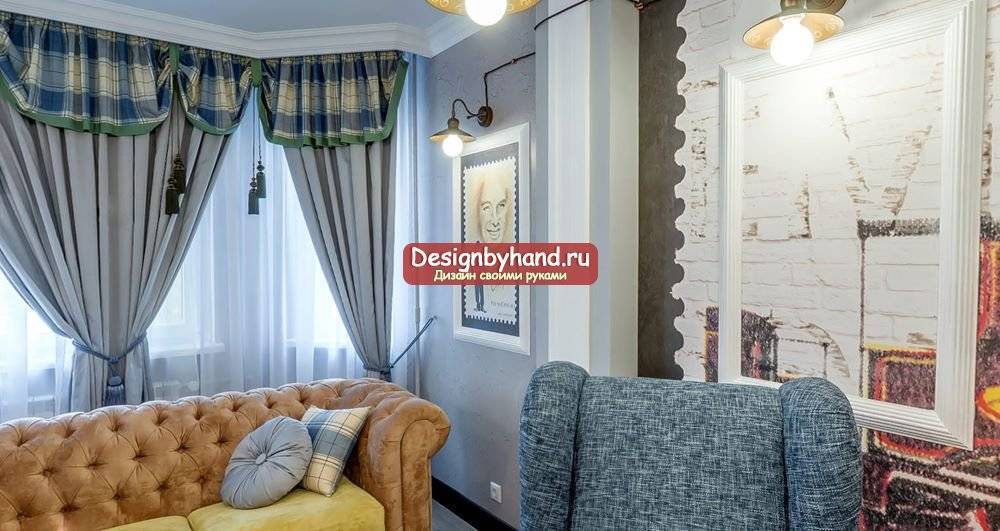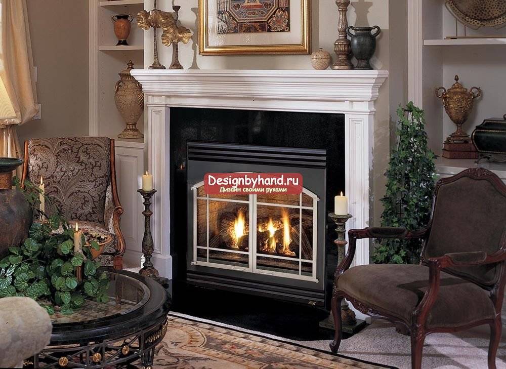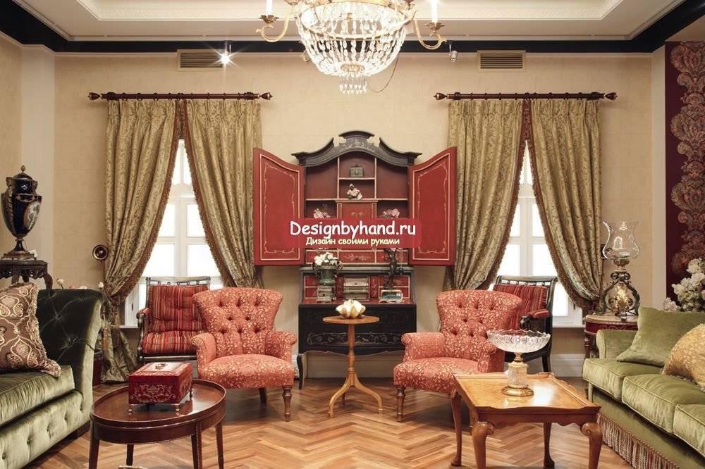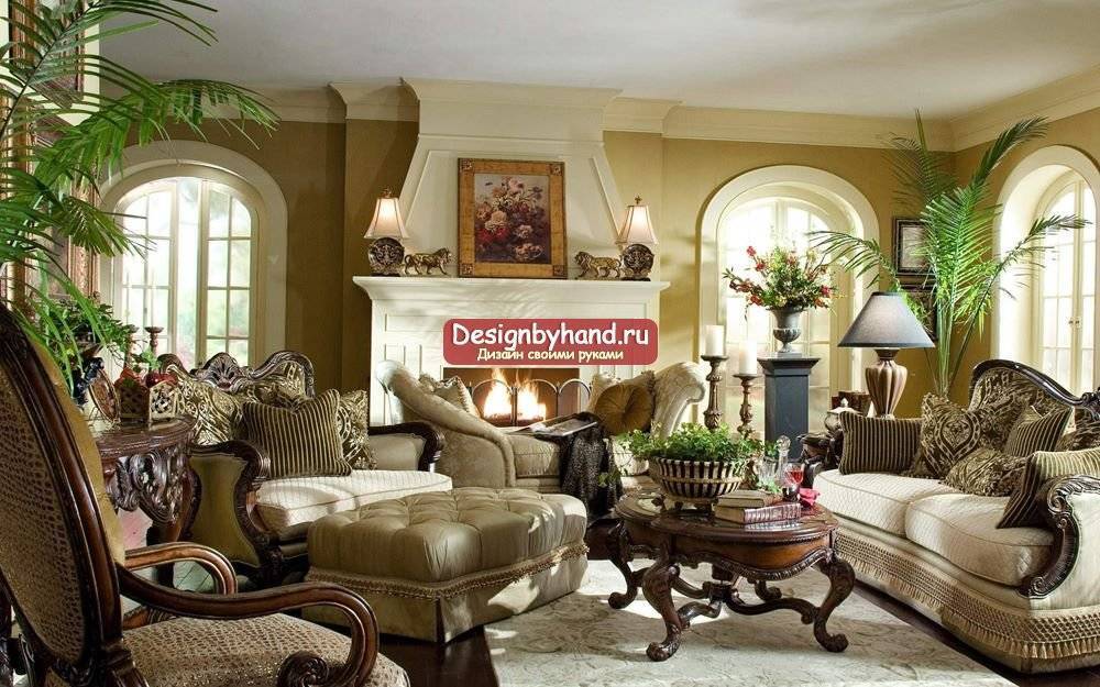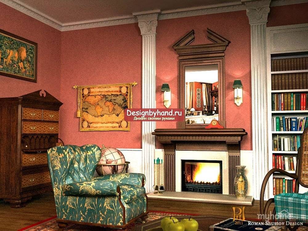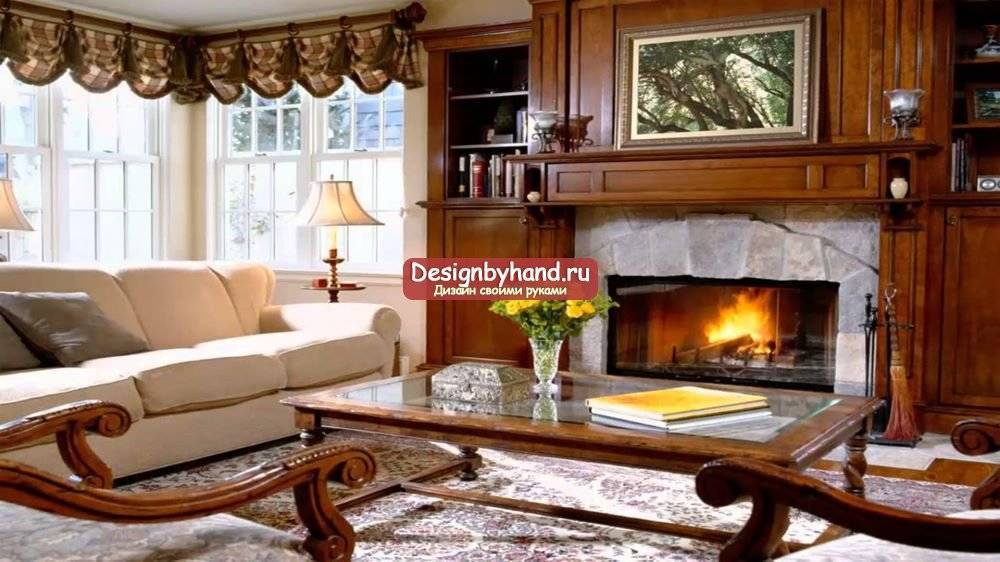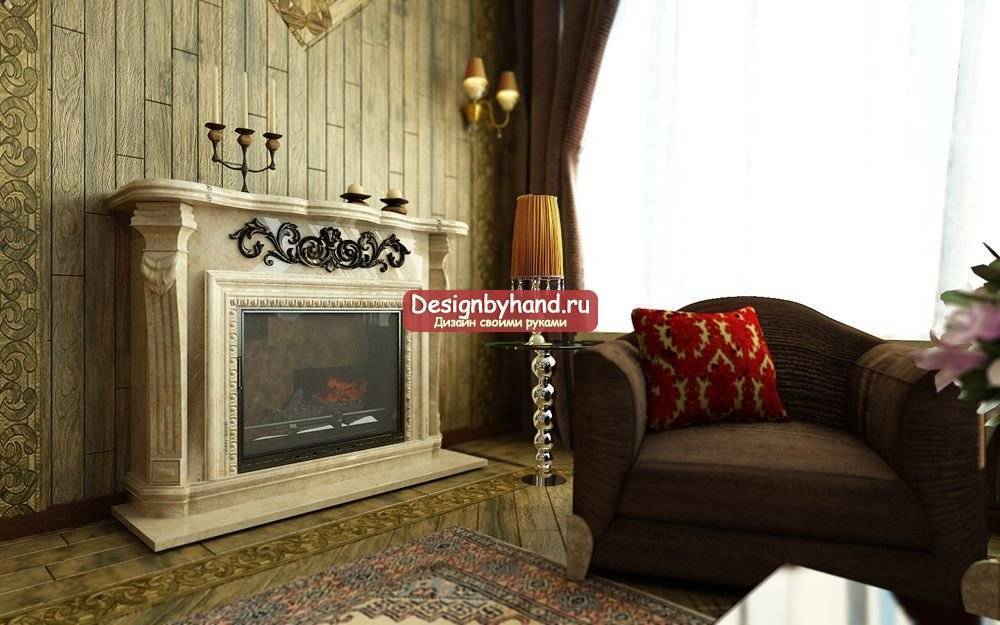 Традиционный камин – это ключевое звено интерьера, радом с ним прекрасно впишутся два кресла с ушками и небольшой столик, получится уютный романтический уголок. Завершат оформление гостиной тяжёлые шторы с глубокой драпировкой.
