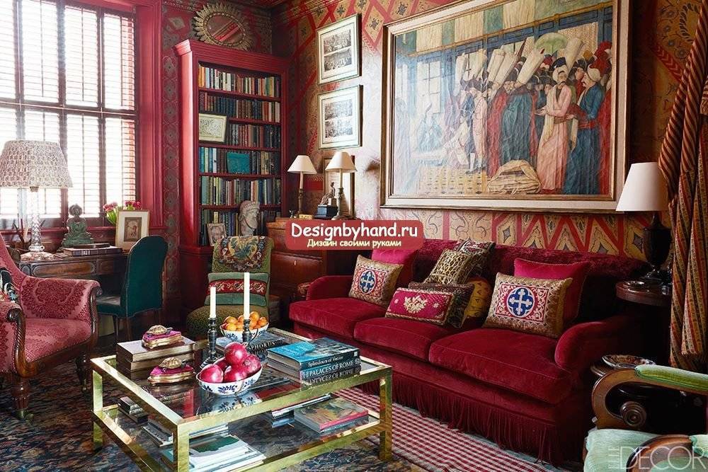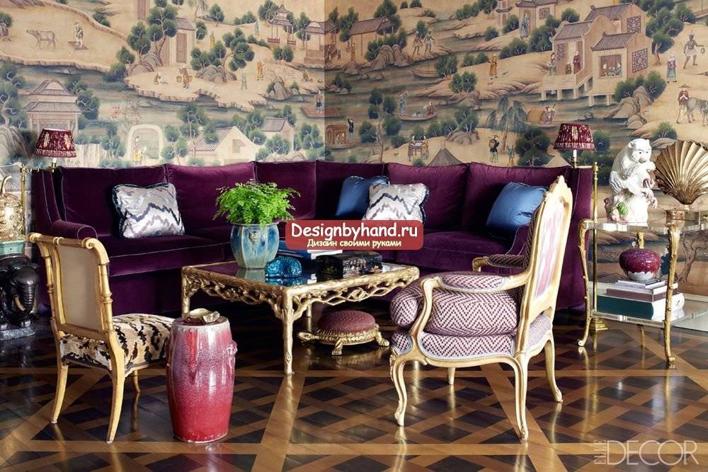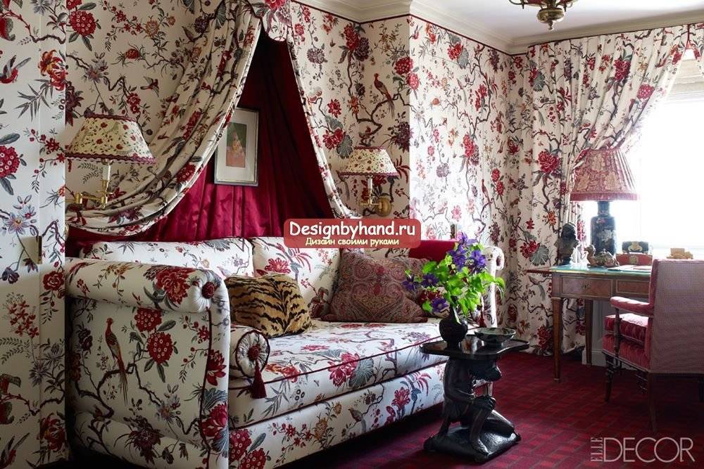 - восточный узор — оригинальный орнамент изображён на текстильных обоях или мягкой мебели;
