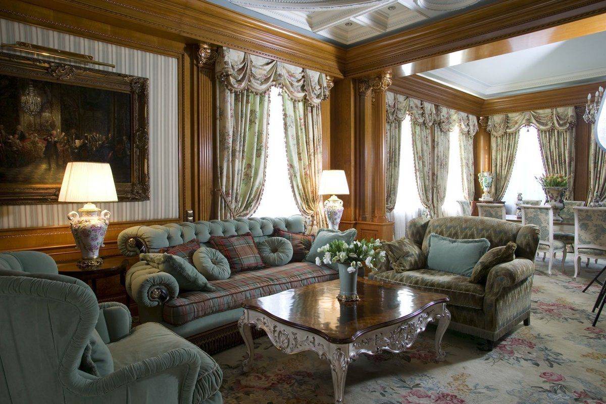 Подчеркнет респектабельность хозяев антикварная мебель и произведения искусства. Это могут быть картины в дорогих рамах, старинные вазы, столики с изящными ножками и уникальные чайные сервизы из настоящего фарфора. Часто в гостиных по центру комнаты стоит большой стол круглой или овальной формы со скатертью и стульями.