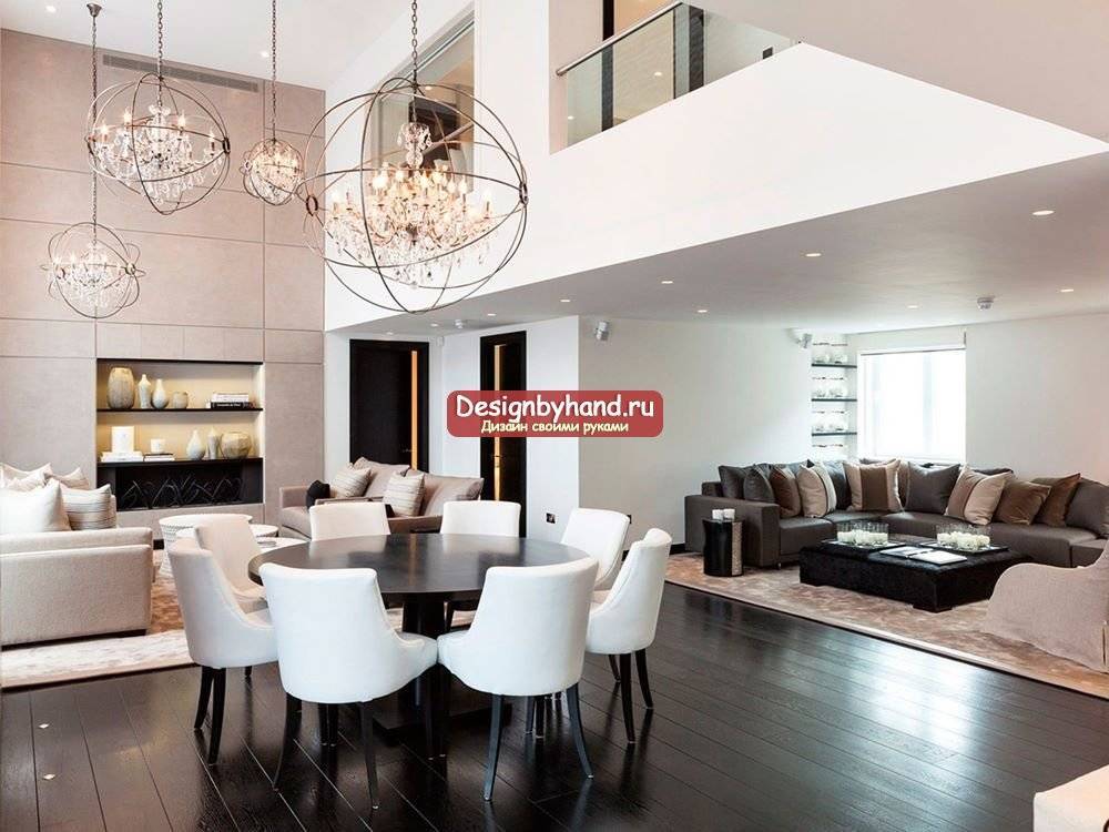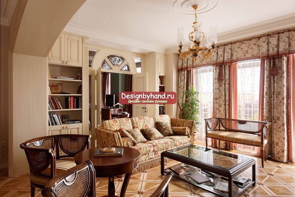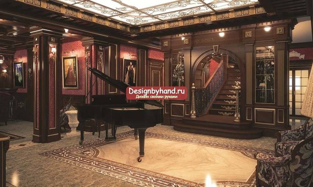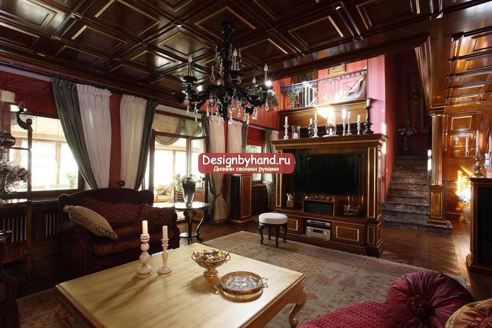 В гостиной должен быть шкаф с книгами. Замечательно, если роль телевизора в интерьере заменит рояль или камин. Большая хрустальная люстра наполнит пространство светом, ковер добавит уюта.