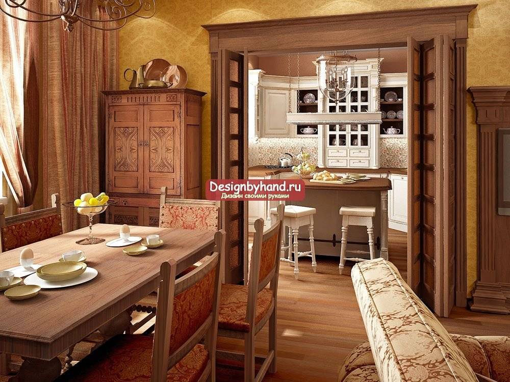 Центральным звеном кухни-гостиной в английском стиле станет круглый стол со стульями или остров от кухонного гарнитура. Всё оформление помещения должно быть в персиковых оттенках, в сочетании к которым можно выбрать мебель красно-коричневого цвета. Если позволяет площадь, обязательно следует в углу разместить диван с обивкой из жаккардовой ткани. Вместо классического набора мебели лучше отдать предпочтение серванту или буфету, на полках которых можно расставить красивые сервизы.