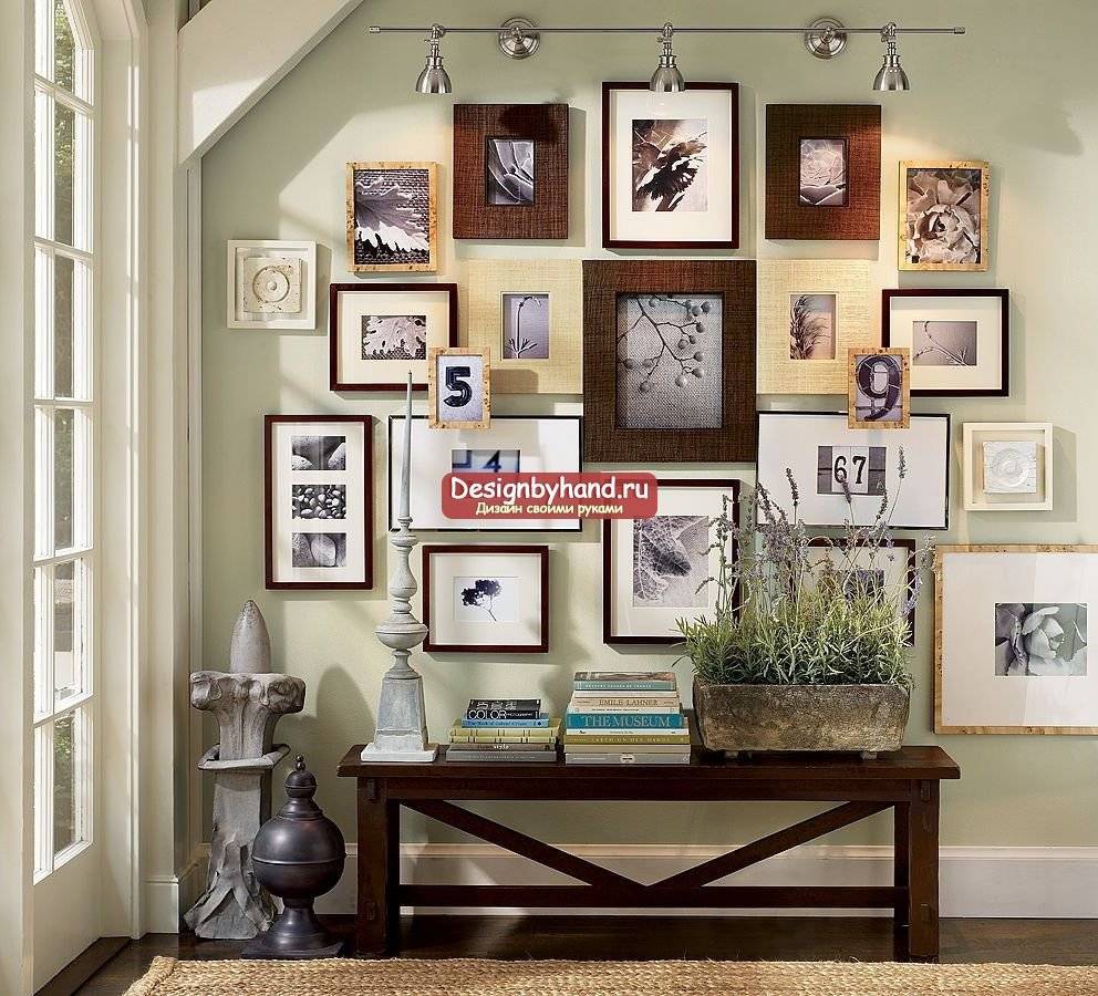 На стенах коридора приветствуется вывешивание семейных или банкетных фотографий в деревянных рамах. В качестве функционального табурета может выступать пышный пуф с вышитым объёмным узором.