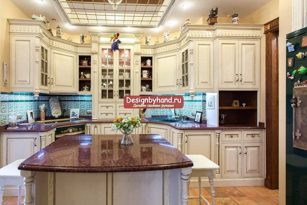 Ключевыми акцентами английского интерьера кухни станут каменная столешница, смеситель из латуни и красивая люстра с хрустальными подвесками.