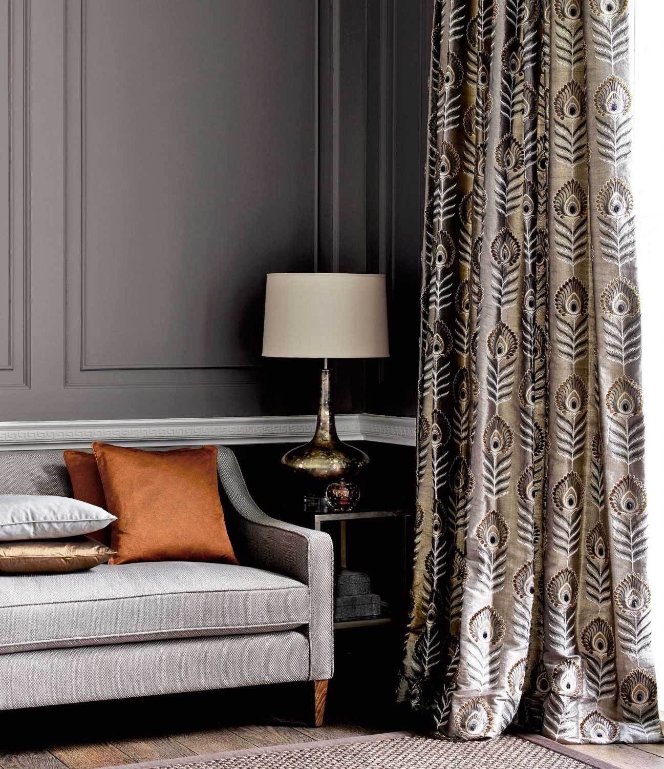Также роскошно и красиво с бирюзовым сочетается золото, особенно если в оттенке больше зеленого, а не голубого. Можно использовать золотистый орнамент на самой шторе или использовать аксессуары золотого цвета.