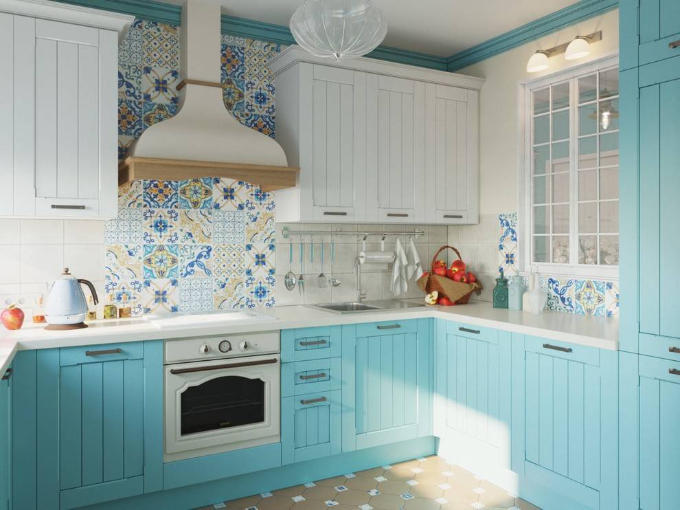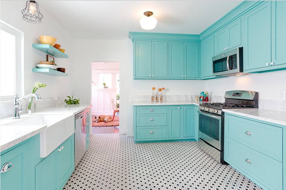 Этот оттенок присущ кухням в винтажно-сельском стиле (кантри, прованс). Объяснение этому простое: раньше выбор красок был невелик, а мебель почти вся являлась крашеной. Самыми доступными и распространенными красками долгое время были синий и зеленый. Их смешивали, разбавляли белой краской и получали нежную бирюзу.