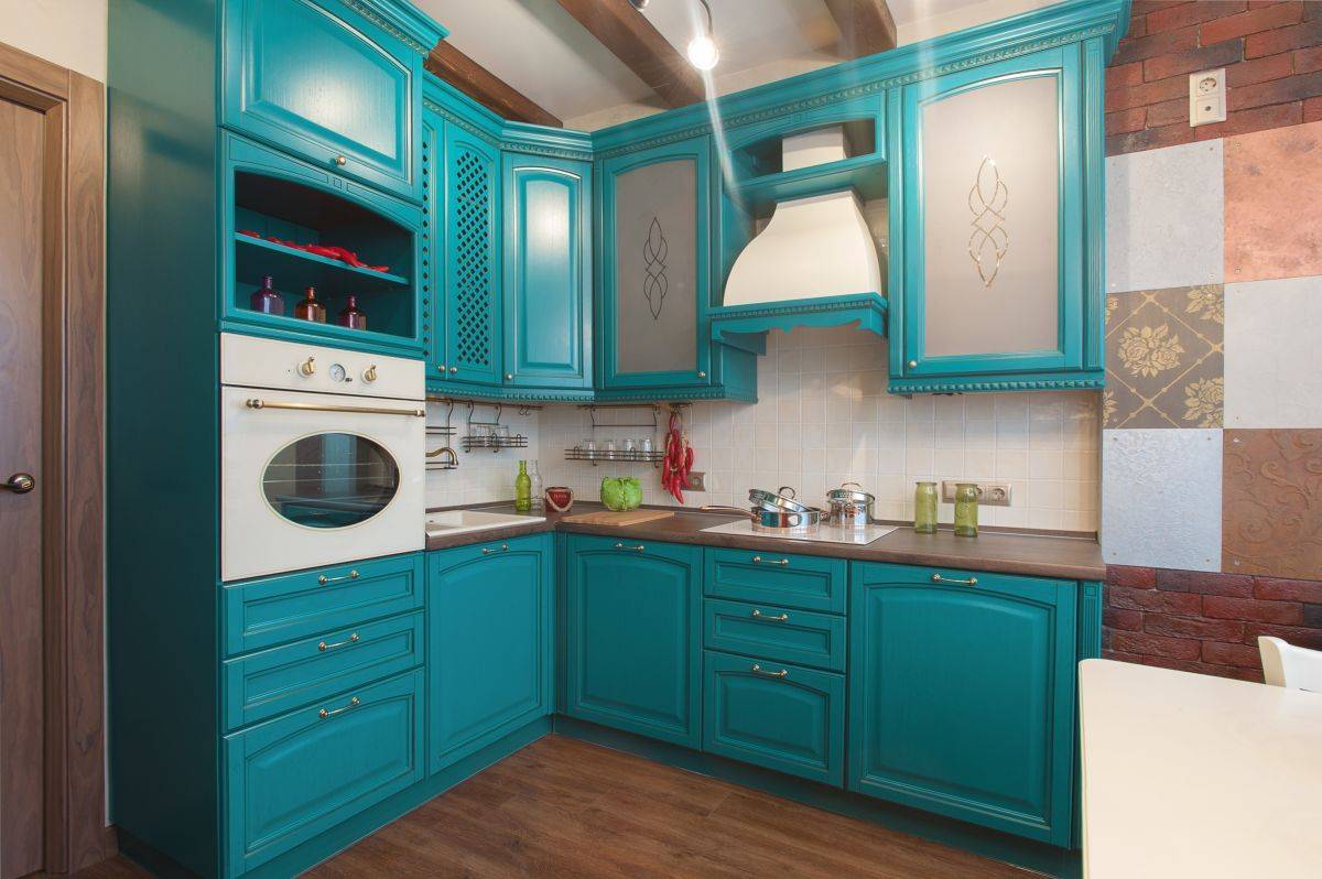 Классика на кухне — это в первую очередь филёнчатые фасады. В бирюзовой кухне они могут быть: