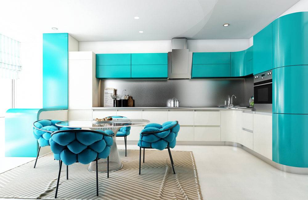 Когда дизайн интерьера позволяет нам добавлять декоративные детали и сочетать несколько акцентных тонов, роль бирюзы становится не настолько доминантной. Кухонный гарнитур в современном стиле стоит разбить на 1–2 секции разных цветов и добавить бирюзы за счёт декора либо выбрать светлый ненавязчивый бирюзовый оттенок.