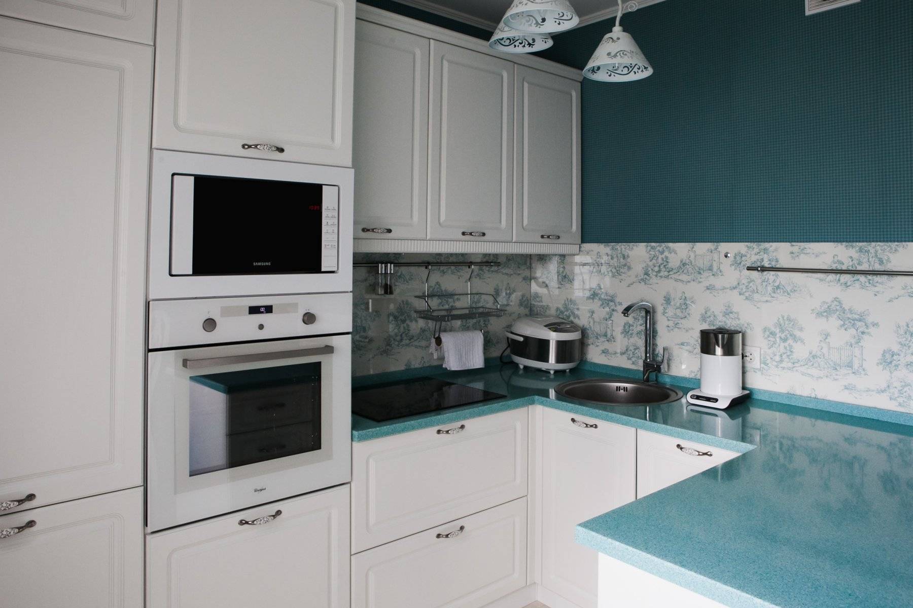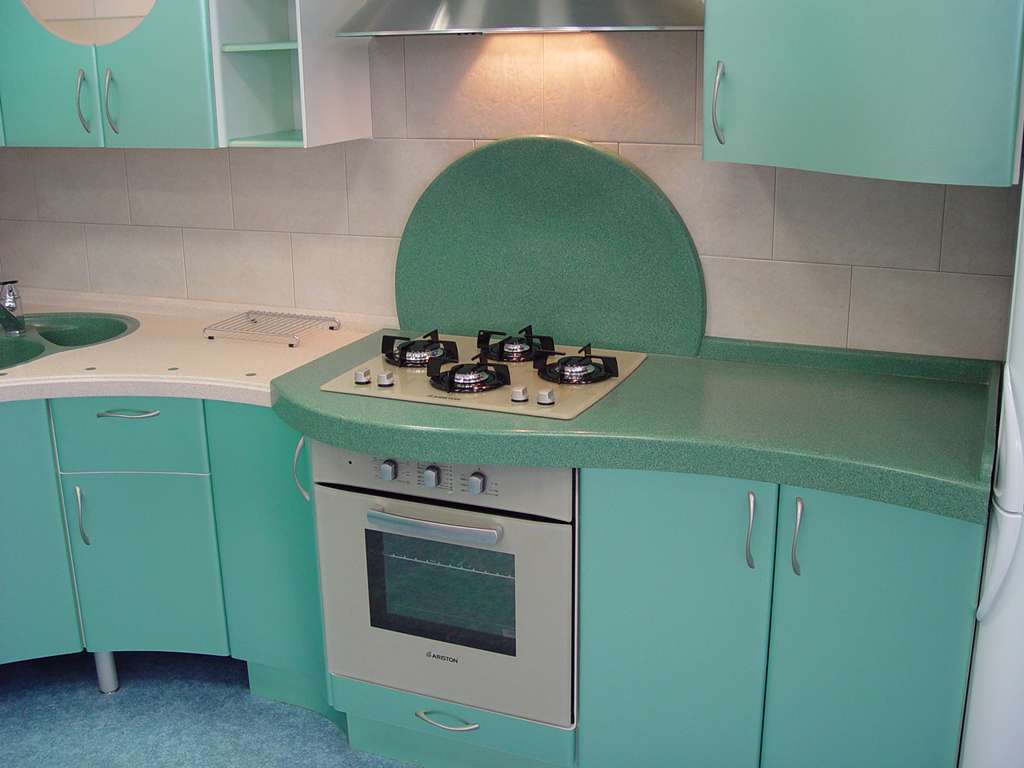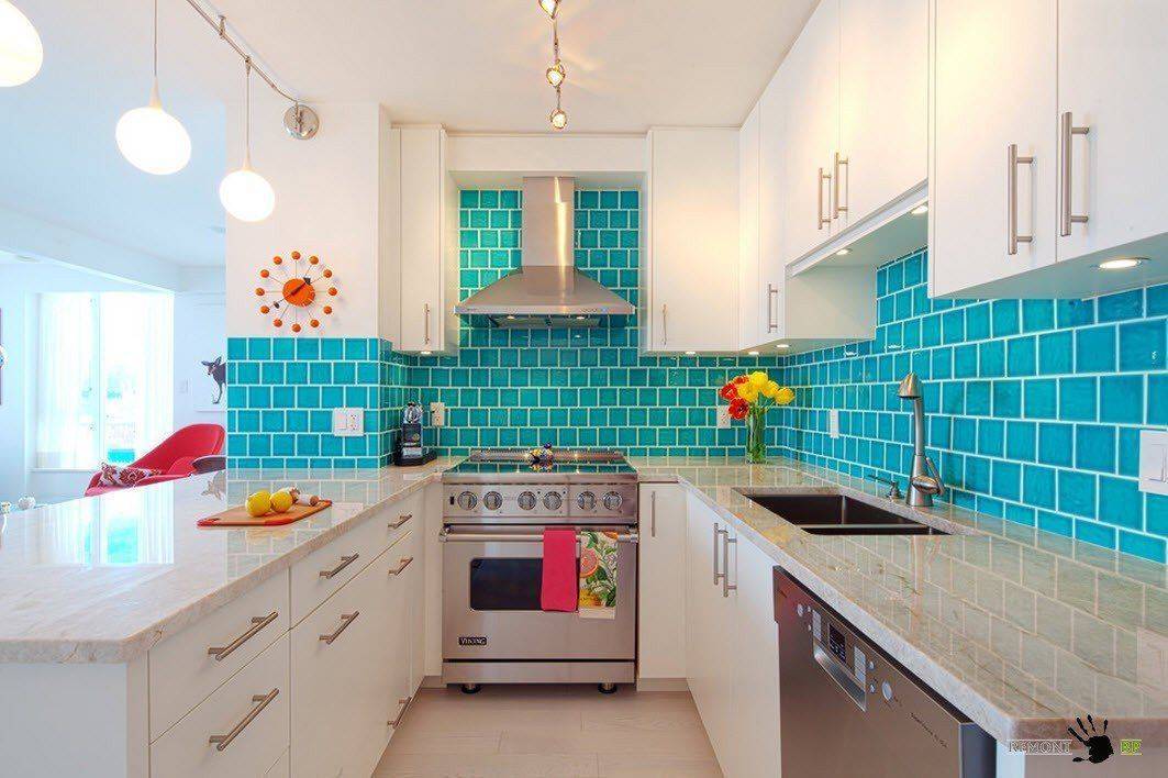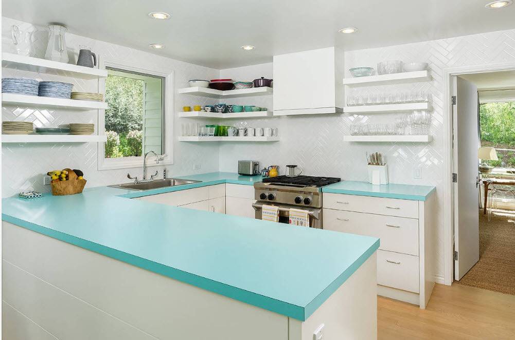 Бирюзовый цвет дает возможность помимо традиционных бело-серых столешниц использовать более оригинальные цвета и материалы: нержавеющая сталь, натуральное дерево, гранит.