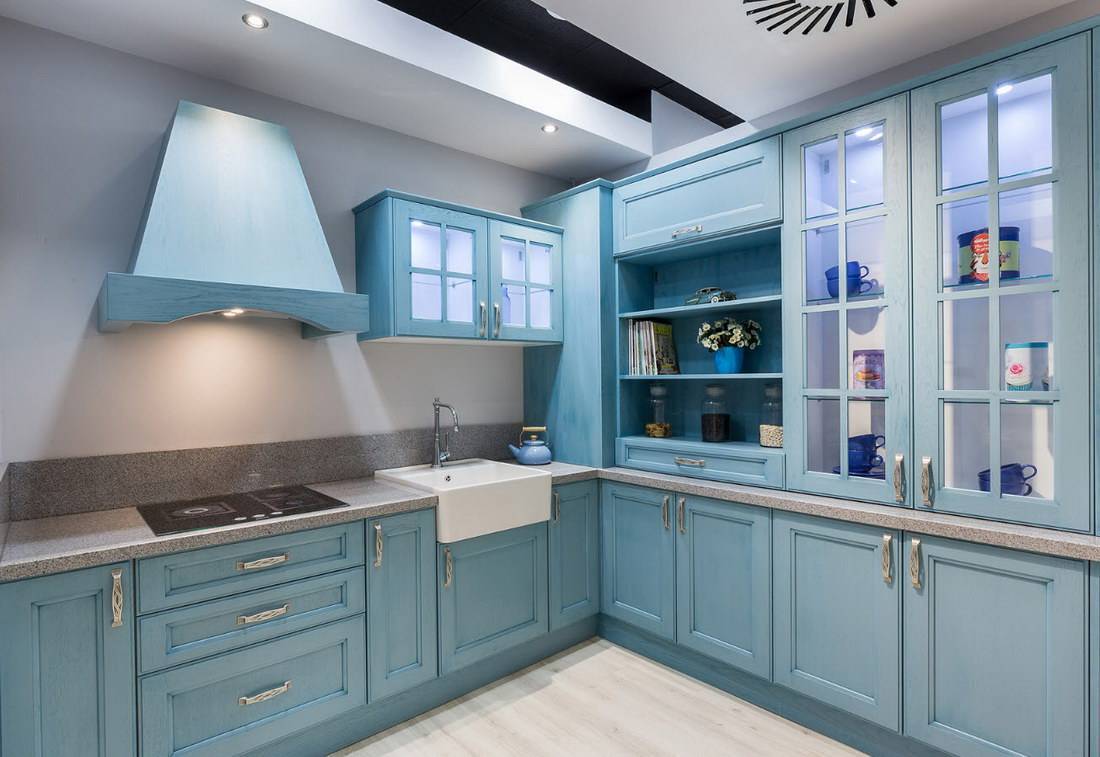 Этот стиль недалеко ушёл от предыдущего, но отличается рядом моментов, среди которых и применение грубых фактур. Если в провансе фасады должны быть классическими резными, то кантри позволяет не только более скромную форму филёнок, но и имитацию щита из досок. Кантри предполагает обилие желтоватого и золотистого дерева, поэтому для него очень хорошо подходят яркие аквамариновые тона.