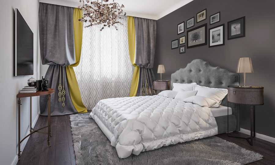 - Жёлтый цвет. Сегодня все больший оборот набирает сочетание серого с жёлтым в дизайнерском решении. В зависимости от выбранных оттенков, интерьер может получиться уютным и спокойным, или напротив, будет преобладать дерзкий и яркий акцент. Варианты штор под серые обои.