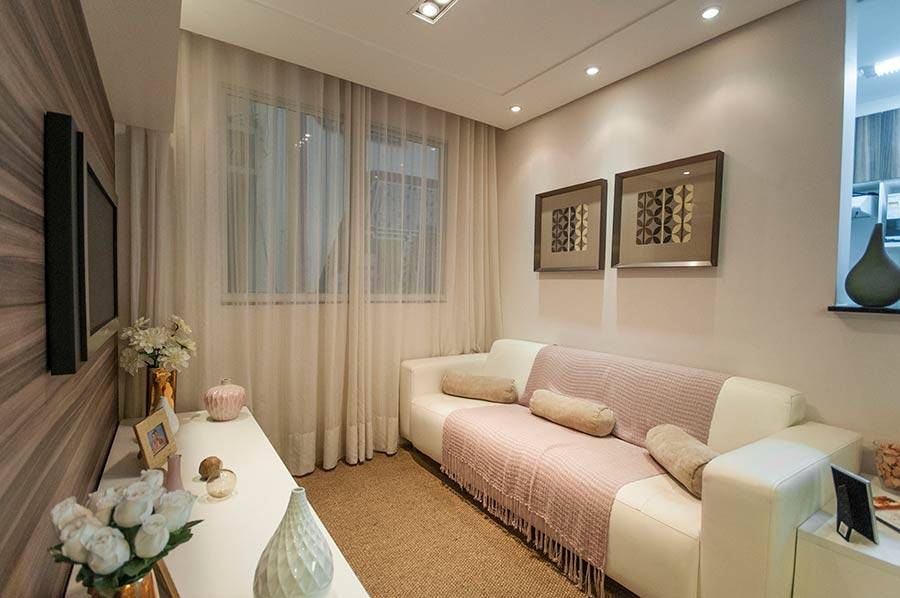 Еще одной особенностью для гостиных комнат небольшого размера является освещение. Качественное и правильно подобранное освещение, так же как и цветовая гамма интерьера, способны зрительно увеличить площадь комнаты как квадратной, так и прямоугольной планировки. Также большую роль играет естественное освещение. Для окон рекомендуется использование легких светлых тканей или тюля.