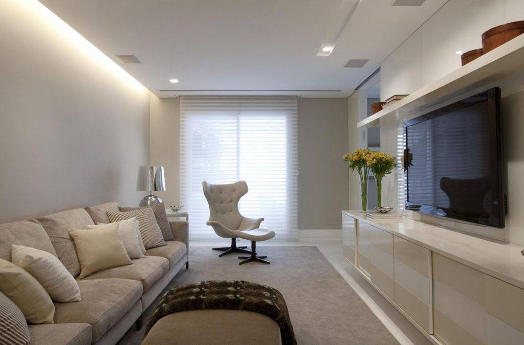 Для вытянутого пространства выбирают линейную расстановку мебели. Возле одной длинной стены располагают диван, а параллельную плоскость дополняют модульными шкафчиками и телевизором.