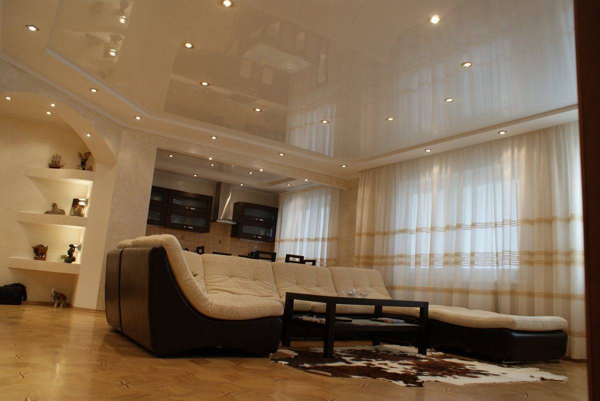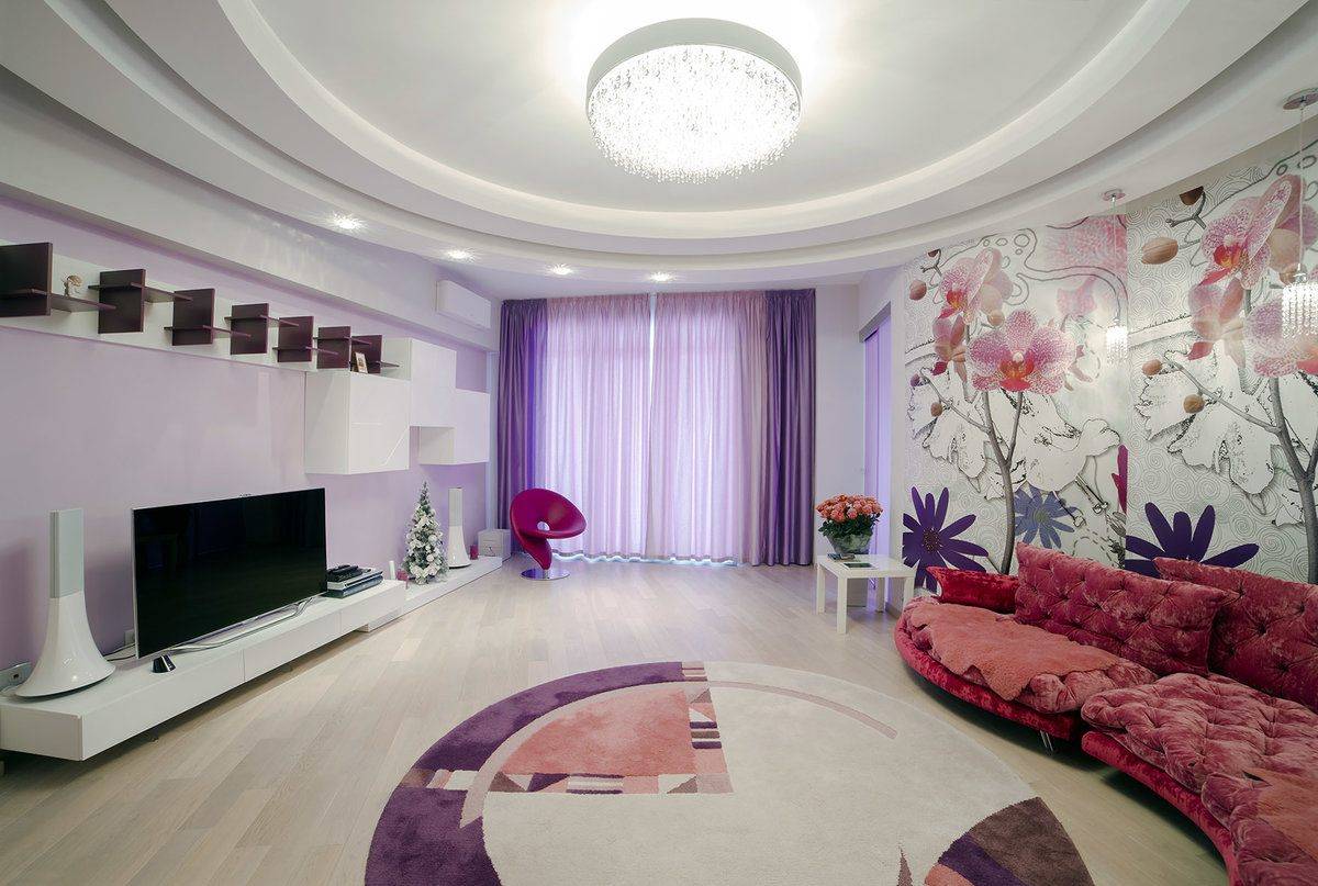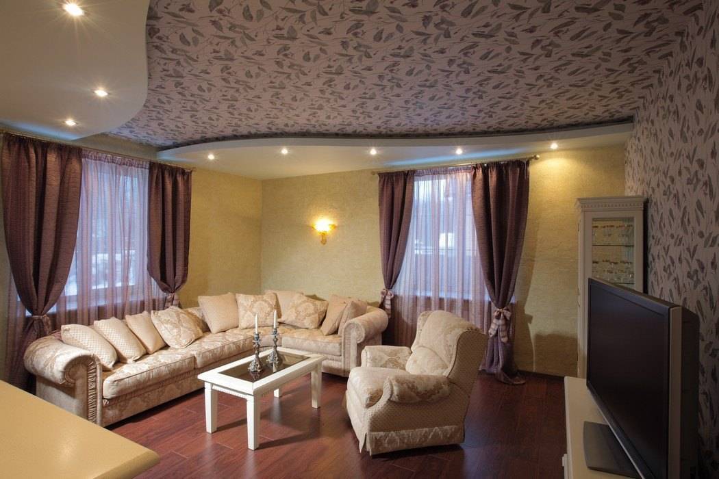 Подвесные, натяжные, многоярусные потолки – интересный вариант при оформлении гостиной или спальни. Глянцевые покрытия визуально увеличивают пространство и прекрасно гармонируют с обоями с фотопечатью, особенно, когда рисунок или форма потолка перекликается с отделкой стен.