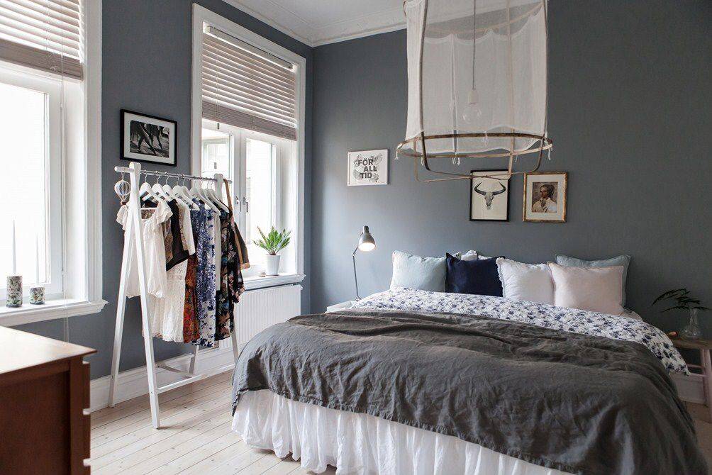 Поставьте двуспальную постель прямоугольной формы с минимально низким изголовьем или без него. По бокам кровати установите две лаконичные тумбы светлого цвета, на которых будут стоять небольшие светильники с матовым белым стеклом. Одежду и остальные вещи лучше всего хранить в гардеробной или в шкафу с легкими створчатыми дверьми.