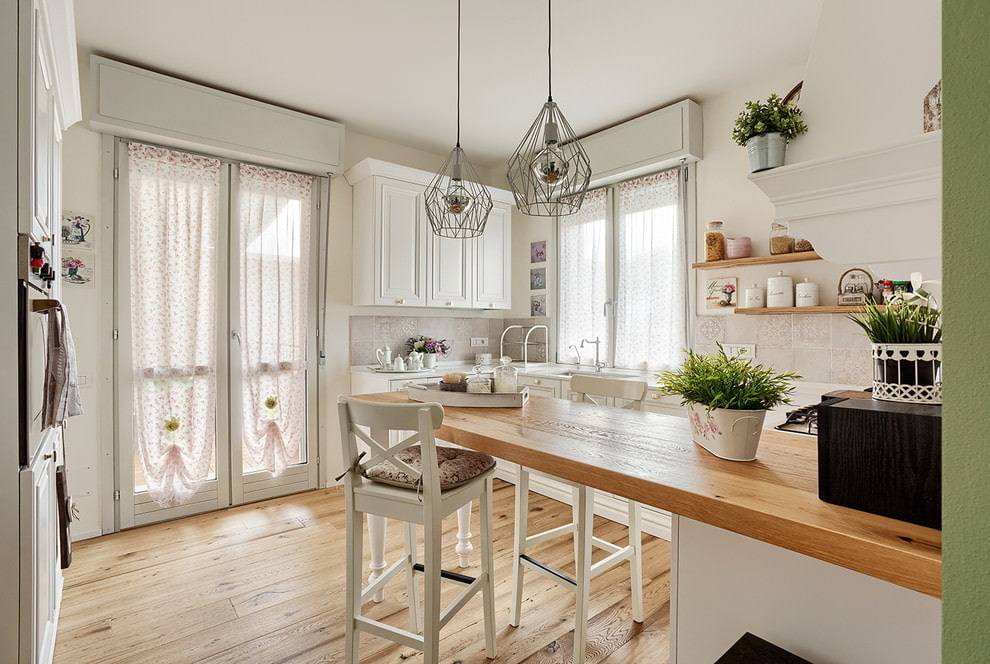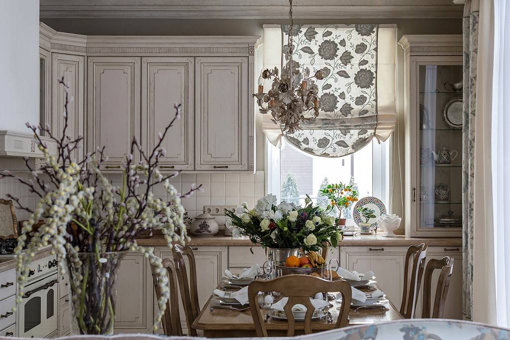 Прованс – один из немногих стилей, где можно позволить себе больше текстиля. Романтичные занавески, шторы с подхватами и рюшами, мягкая обивка кресел, ажурные скатерти и салфетки на столе – ключевые элементы для создания деревенского уюта.