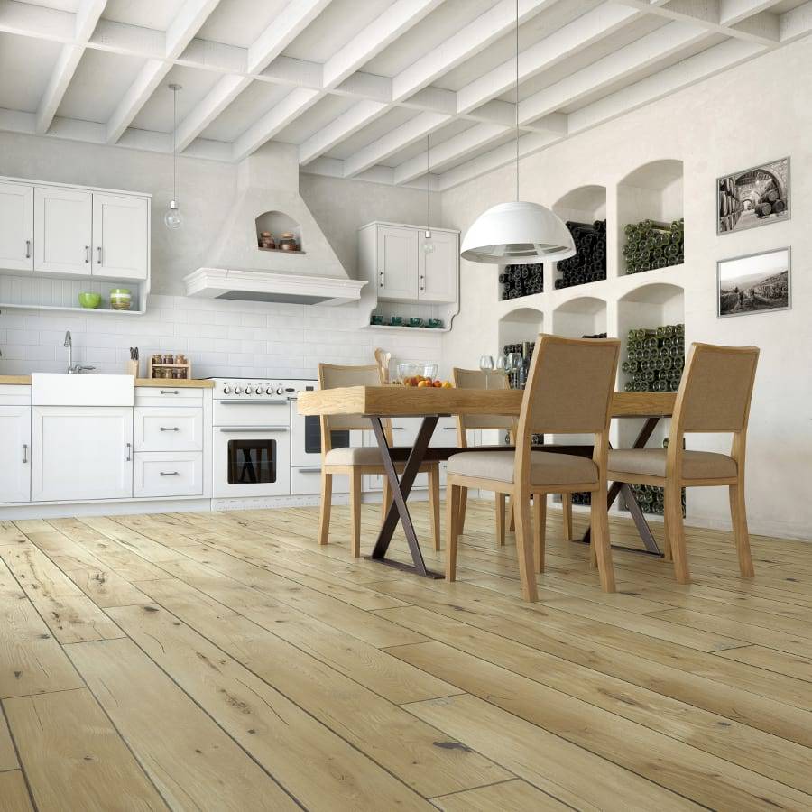 Дощатый пол или керамогранит под состаренный камень – наиболее удачные варианты отделки.