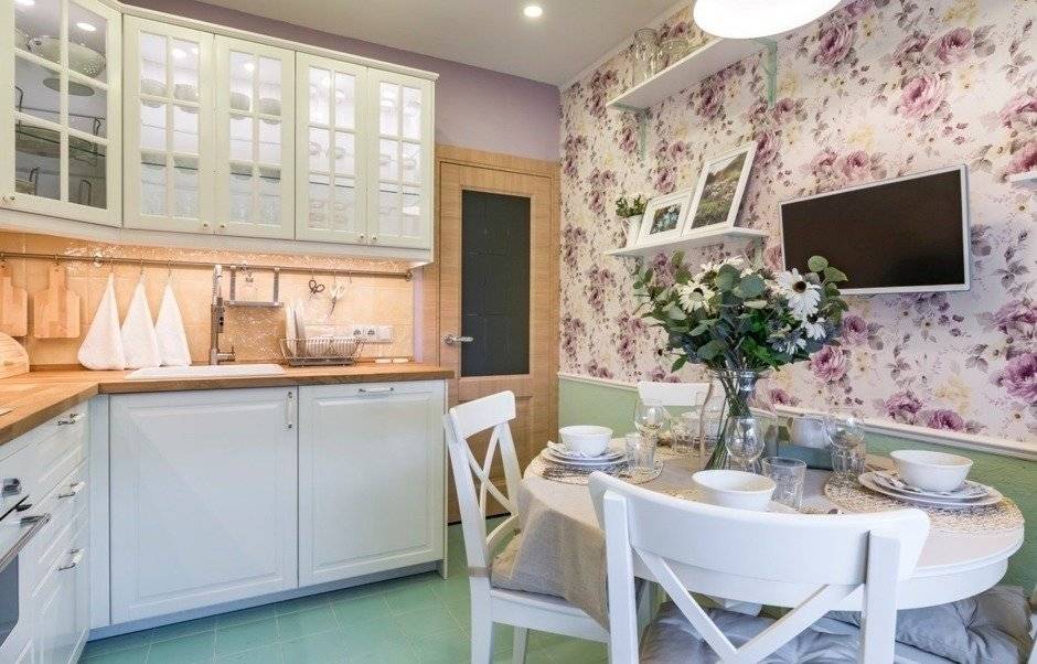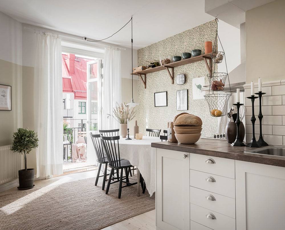 Выделить фартук можно с помощью активного узора в стиле пэчворк или рисунка на обоях, защищенных в рабочей зоне матовым, прозрачным стеклом.