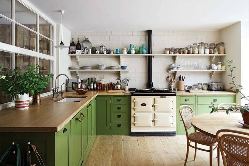 Идеальный гарнитур для кухни в стиле прованс – с рамочными фасадами из массива, с патиной, легкими потертостями, выбеленный или выкрашенный в бежевый, молочный или любой другой, характерный для данного стиля оттенок.
