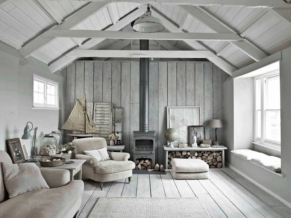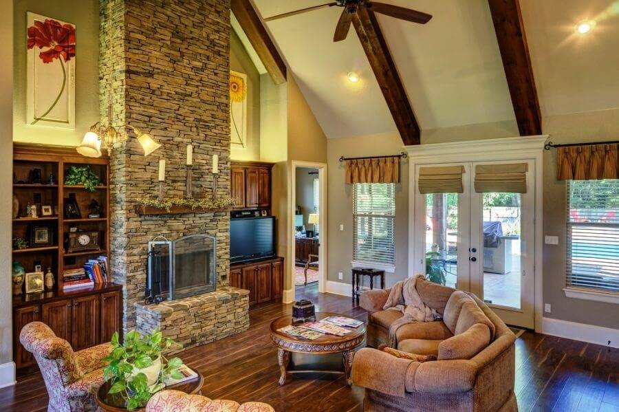 Незаменимым элементом станет камин (декоративный или настоящий решать только вам), ведь что, как не он ассоциируется с домашним теплом и очагом? Только представьте, как вся ваша семья зимним вечером соберется возле него с чашкой чая и ароматной выпечкой и будет делиться интересными историями из жизни.