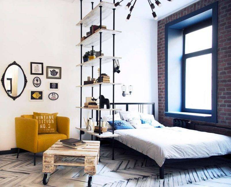 На фото дизайн спальни-гостиной, выполненный в промышленном стиле.