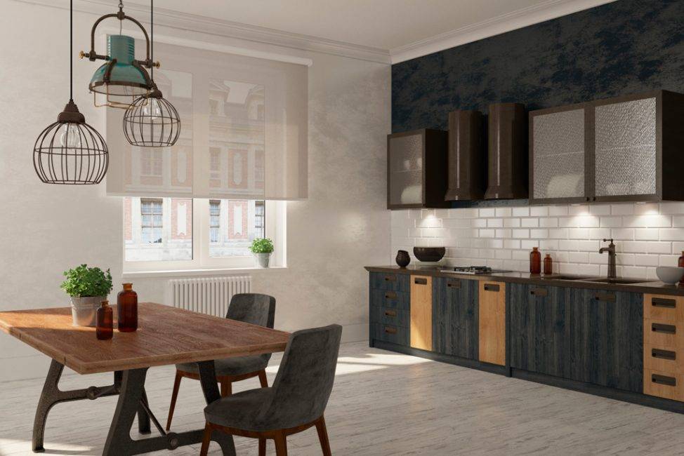 В отделке предпочтение отдают грубому камню, металлу, дереву и плитке. Кухонный фартук можно выложить плиткой, имитирующей кирпич, или же украсить стальными панелями. Столешница также может быть выполнена из стали. Смело объединяйте различные фактуры, используйте хромированные и стеклянные элементы.