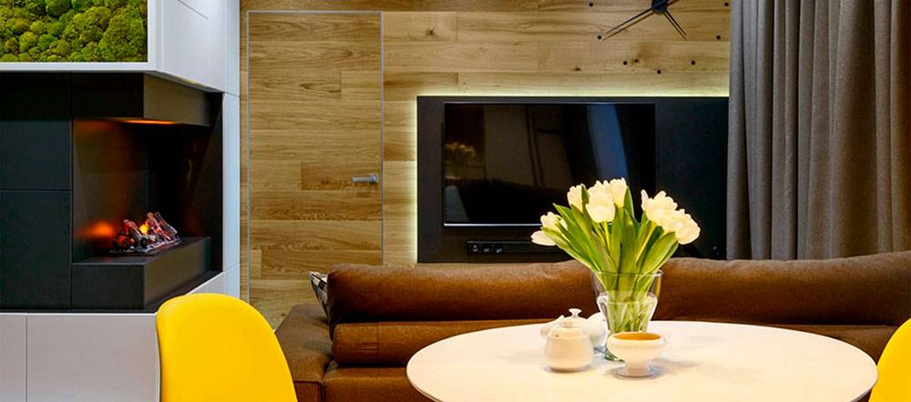 Придать непревзойденности гостиной может простой камин без украшений и декора ‒ топка на фоне стены. В таких конструкциях виден только очаг с пламенем. Не обязательно выбирать камин на дровах, который подойдет только владельцам частных домов, из-за наличия дымохода. В квартире можно поставить электрический или биокамин.