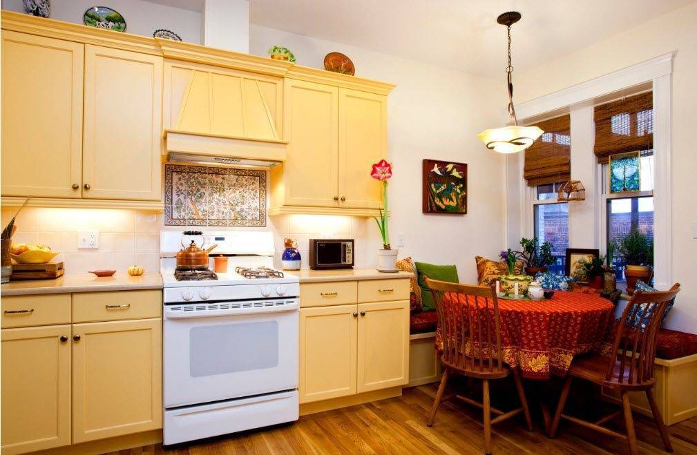 Дизайн кухни в стиле прованс не боится ярких красок. Желтый, охряной, бордовый, фиолетовый подчеркнут уникальный характер интерьера. Конечно, использовать их нужно крайне аккуратно. В этом случае яркость – в основном прерогатива текстиля и декора. Шторы, подушки, ковры, картины, цветы и цветочные узоры будут хорошо смотреться на фоне сдержанной отделки. Чем меньше помещение, тем уже цветовая гамма. В противном случае интерьер раздробится на хаотические куски.