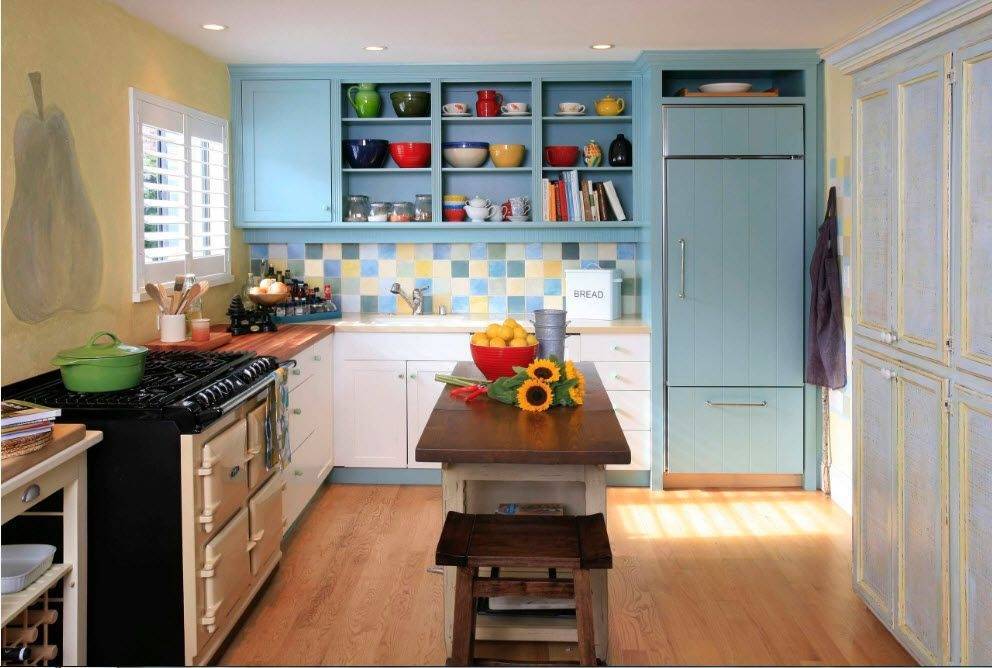 Угловая кухня в стиле прованс может быть несколько неоднородной по цвету. Например, бело-голубые фасады в тандеме с деревянными столешницами. Если любишь яркие краски, добавь насыщенные акценты с помощью посуды и открытых полок. В помещении квадратной формы стол может быть узким и вытянутым, со встроенными нишами по бокам. Однако этот вариант подойдет для небольшой семьи или же в том случае, если предусмотрена полноценная обеденная зона в гостиной.