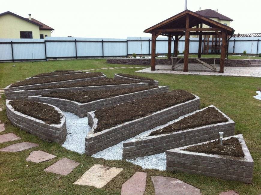 Пространство между грядками может быть заполнено галькой или разделяться маленькими тропинками.
