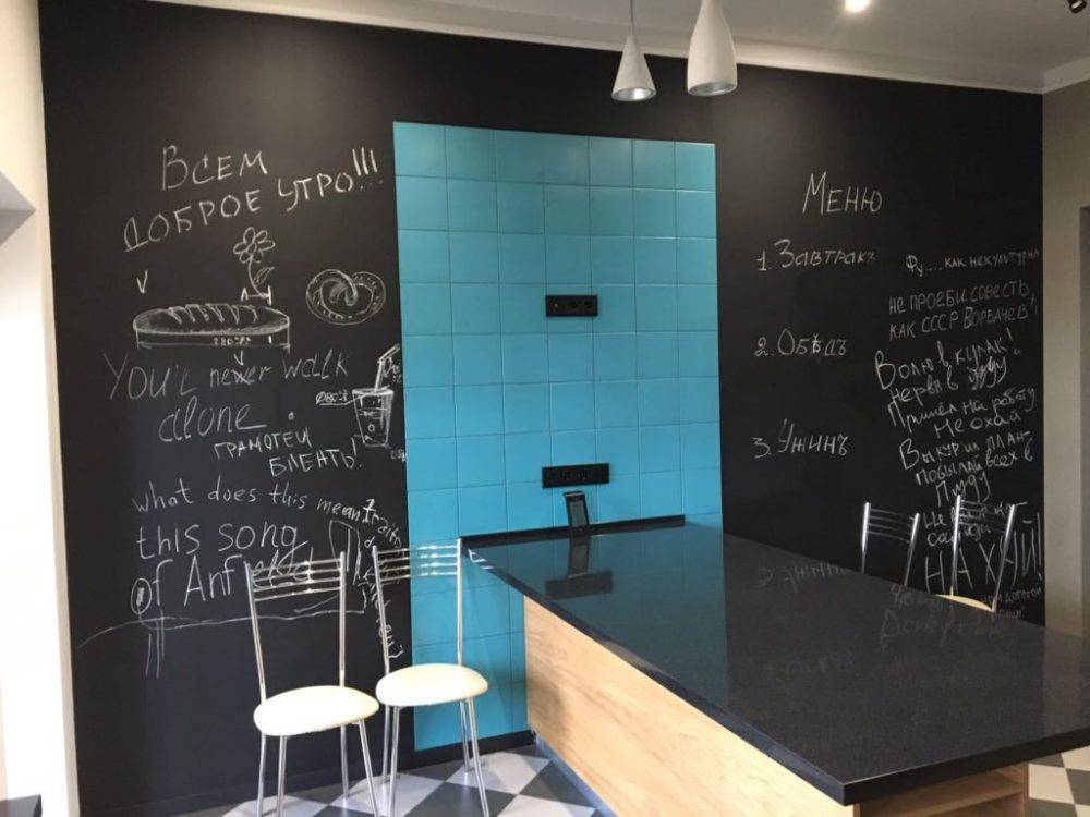 Положительная черта использования грифельной краски на кухне – это износостойкость и влагоустойчивость. Материал имеет высокий уровень функциональности в данном помещении. Лучше использовать грифельную краску на небольших элементах декора, например: оформить часть стены у холодильника, чтобы оставлять списки продуктов, писать пожелания о еде хозяйке. Отлично будет смотреться выделенный прямоугольник у обеденного стола. Домочадцы смогут оформлять меню и приветствия, а гости – выражать свою благодарность хозяйке. Не стоит применять этот состав вблизи плиты – краска может обесцветиться от горячего жира.