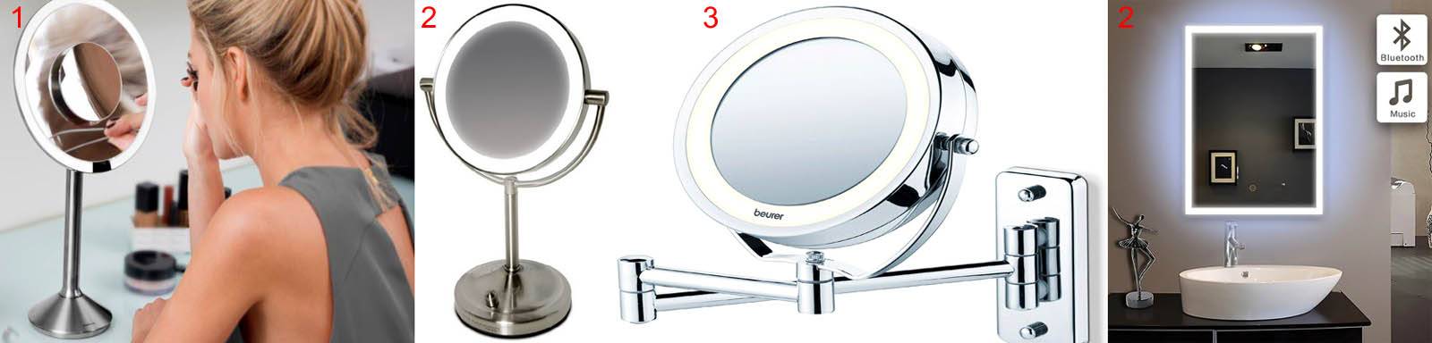 Туалетные зеркала со светодиодной подсветкой лица выпускаются компактные увеличительные, поз. 1-3 на рис. При помощи такого зеркала можно на скорую руку привести себя в божеский вид в гостях, на работе, в командировке, на пикнике или оценить свое лицо «как есть» после душа. Большие зеркала с подсветкой светодиодными лентами продаются как ванные, туалетные, (но не гримерные) со всяческими бонусными опциями (поз. 4), но особым спросом не пользуются. Навести на себя настоящую красоту возможно только перед гримерным зеркалом с подсвечиванием лица лампами.