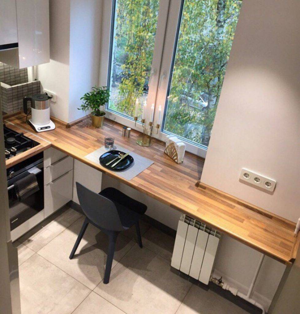 Если заделать нишу и заменить подоконник на столешницу, получится уютная обеденная зона для семейной пары.