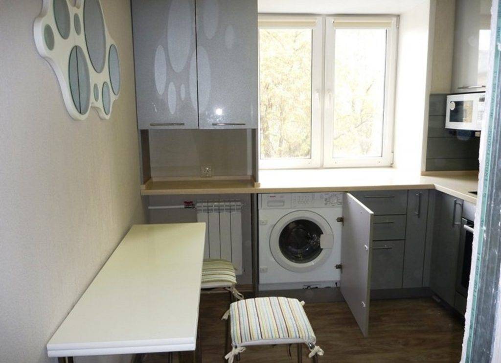 В проёме под окном разместится и бытовая техника. На место бывшего холодильника можно установить стиральную, посудомоечную машину, но для этого потребуется переделать схемы водо- и электроснабжения.