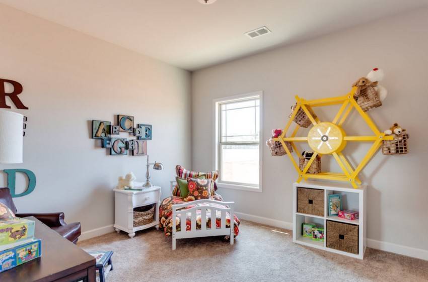 При наличии свободного участка стены к нему можно прикрепить ящики на удобной для детей высоте. Разноцветные или одного тона, выстроенные в строгом порядке или хаотично, ящики станут элементом украшения детской и хранилищем игрушек.