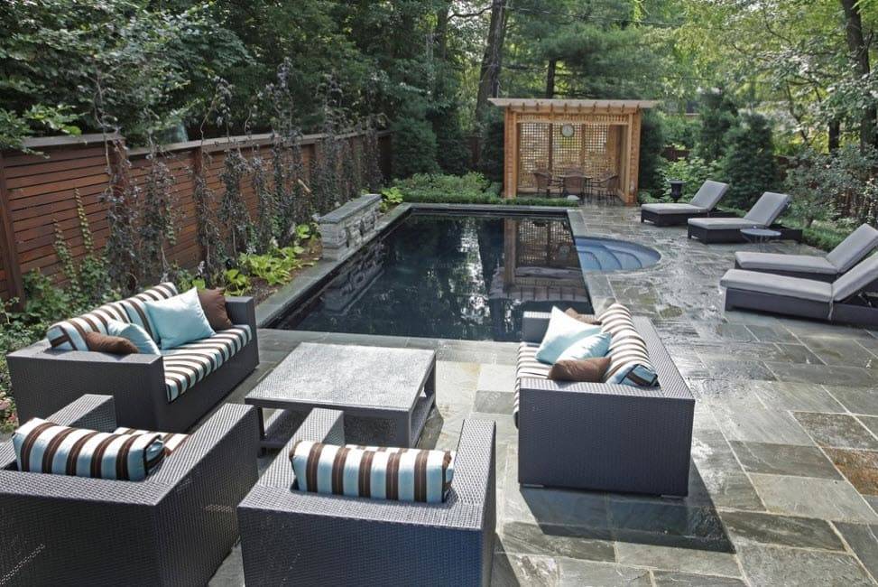 Необычная беседка: крыша с отверстием освещает небольшой прудик. По желанию передвинуть кресла можно в тень или на солнце