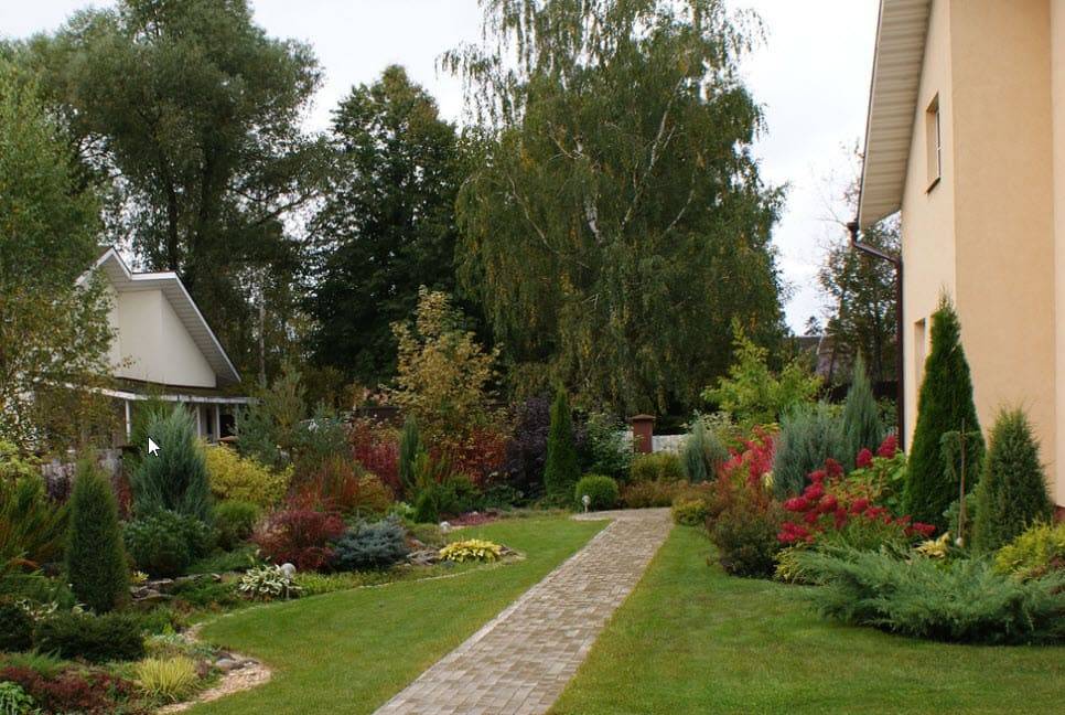 Хорошим примером такого баланса будет дорожка сочетающая в себе прямолинейные и криволинейные формы и объединенная использованием одинаковых материалов.